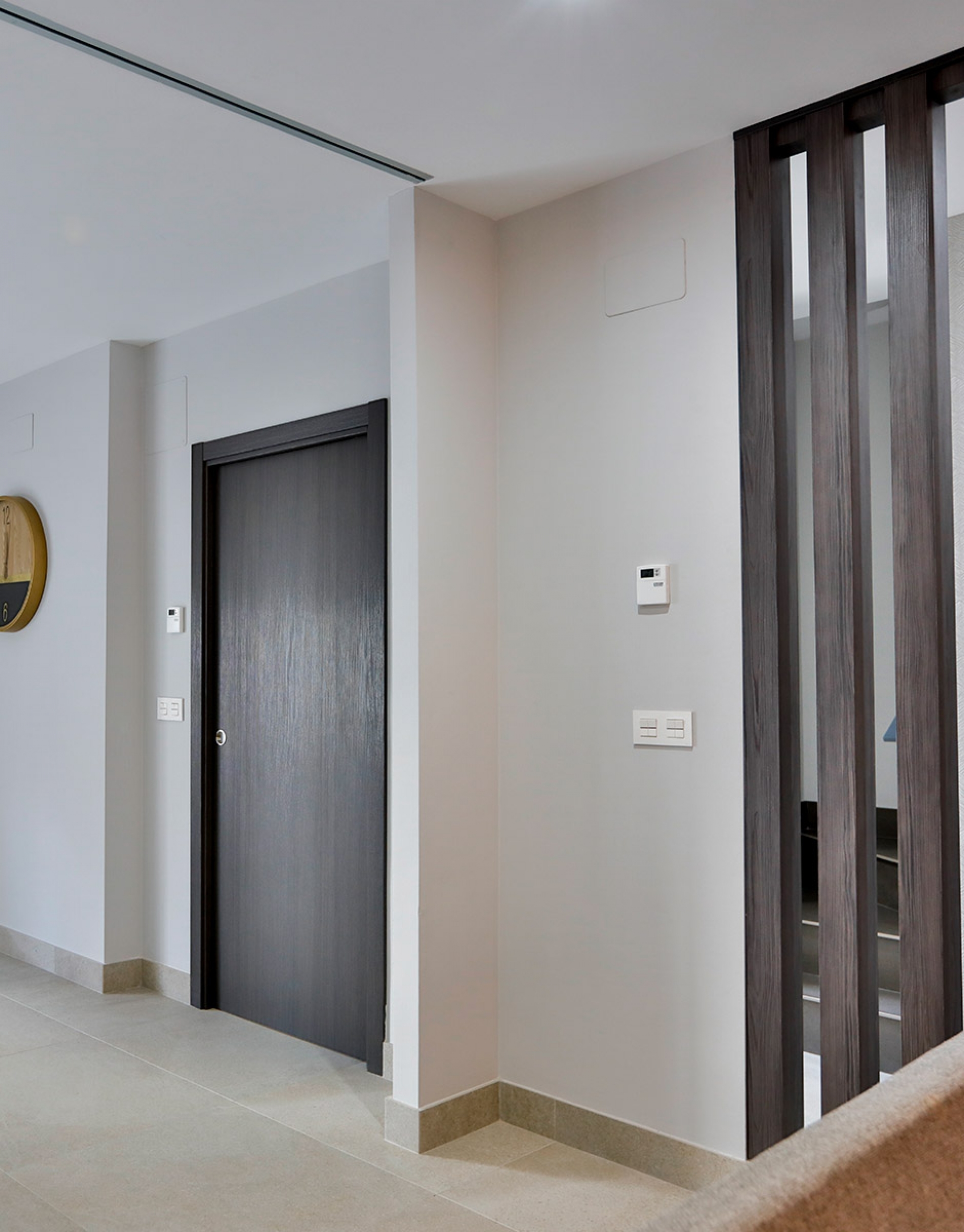 En este proyecto se ha apostado por las lineas rectas y diáfanas que separan distintos ambientes en una misma ubicación. Puertas, cuarto de aseo y una cortina de madera que sustituye uno de los tabiques.